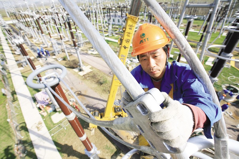 圖為安徽省電力公司員工在安裝線(xiàn)路反弓設備。