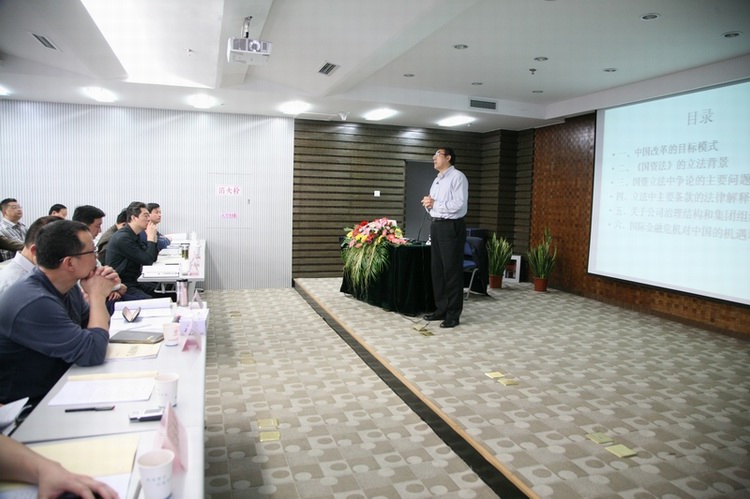 劉紀鵬教授對中國改革的目標模式、國資改革中的政府定位、《國有企業(yè)資產(chǎn)法》的立法背景、立法中爭論的主要問(wèn)題、主要條款的法律解釋等問(wèn)題做了深入的講解,并對參會(huì )人員提出的疑問(wèn)做了認真的解答。此外,他還就國際金融危機對中國發(fā)展的機遇和挑戰提出了自己的獨到見(jiàn)解。