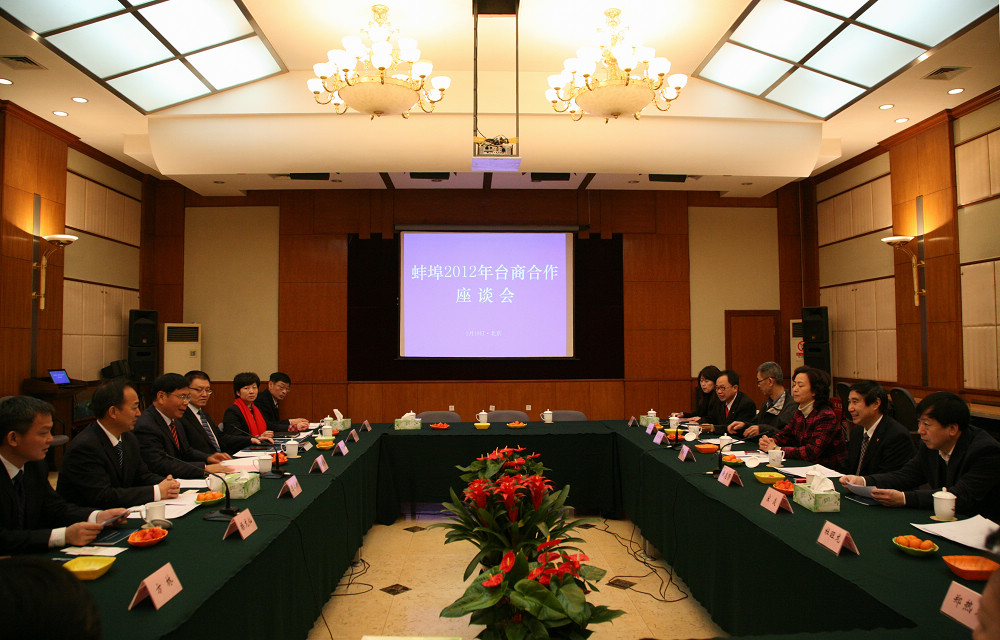 219,蚌埠2012年臺商合作座談會(huì )在北京臺盟中央會(huì )議室召開(kāi)。全國政協(xié)常委、副秘書(shū)長(cháng)、臺盟中央副主席黃志賢、臺盟中央有關(guān)部門(mén)負責同志,市領(lǐng)導陳啟濤、王曉淮、操龍燦出席座談會(huì )。座談會(huì )由王曉淮主持,黃志賢主席發(fā)表講話(huà),陳啟濤致答謝詞并介紹蚌埠市情,蚌投集團作重點(diǎn)招商項目推薦。市招商局及公司有關(guān)負責同志參加座談會(huì )。