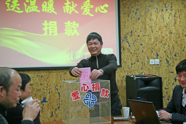予人以愛(ài),人予我愛(ài)。在發(fā)善心環(huán)節,隨著(zhù)一段溫暖的音樂(lè )響起,主持人宣讀了“送溫暖獻愛(ài)心”捐款倡議書(shū),倡導大家奉獻自己的一片愛(ài)心?;顒?dòng)得到了大家的熱烈響應,紛紛上臺捐款,大家表示會(huì )繼續支持公司志愿服務(wù)事業(yè)的發(fā)展,將愛(ài)心傳遞的更加遙遠,讓社會(huì )變得更加友愛(ài)、和諧。