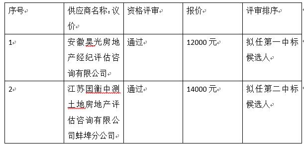高鐵蚌埠南站西廣場(chǎng)、蚌投科技園物業(yè)服務(wù)費評估項目于2021年10月18日發(fā)布招標公告,經(jīng)兩次流標,第三次招標公共于2021年11月04日發(fā)布,2021年11月11日9:00本項目開(kāi)標,三家報名現場(chǎng)兩家參與,按招標文件要求現場(chǎng)議價(jià),經(jīng)過(guò)專(zhuān)家評審,經(jīng)與投標單位溝通均表示不再下浮,按招標文件要求符合議價(jià)程序?,F公告排名如下: