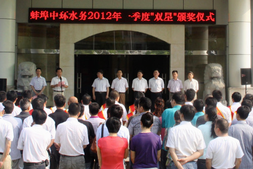 近日,中環(huán)水務(wù)隆重舉行2012年一季度“黨員之星”、“員工之星”頒獎儀式。受表彰的“雙星”和各部門(mén)負責人、部分員工代表百余人參加。紀委書(shū)記傅益群主持會(huì )議,副總經(jīng)理劉西華、工會(huì )主席齊中和分別宣讀了授予2012年一季度“黨員之星”、“員工之星”的表彰決定,并向獲得“雙星”的同志頒發(fā)了榮譽(yù)證書(shū)。